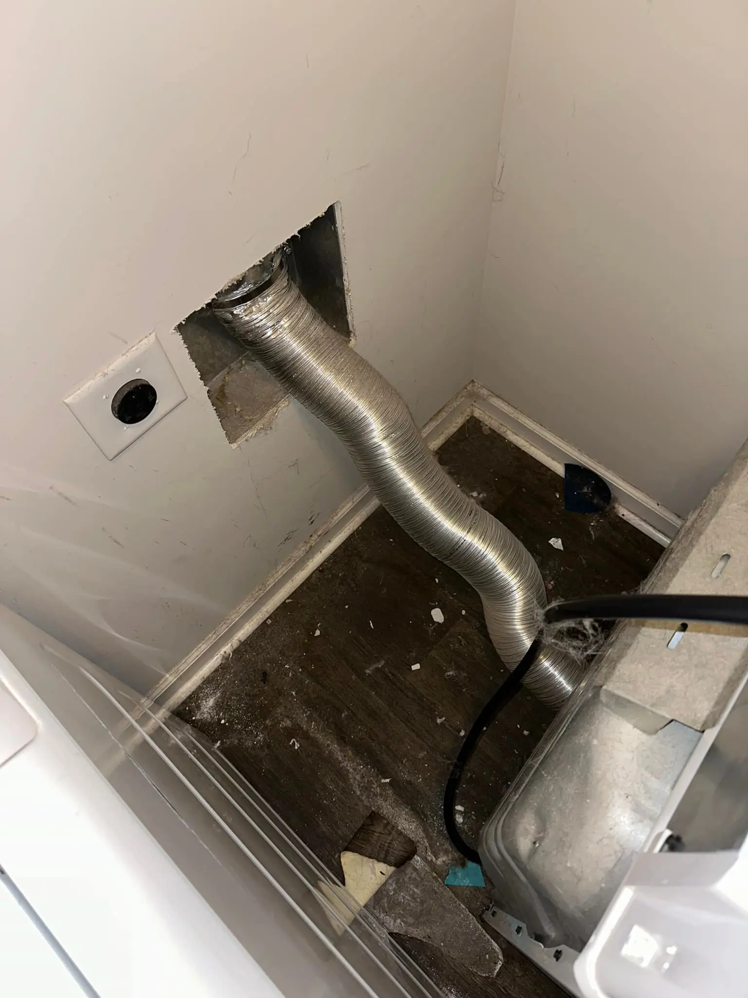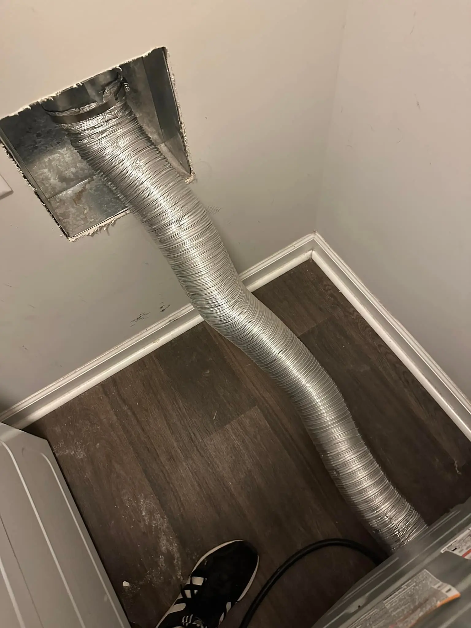 Many homes still use flexible white vinyl or foil ducts. These are highly flammable and trap lint easily, creating a severe fire hazard. Current building codes often require rigid metal ducting for dryer exhaust.